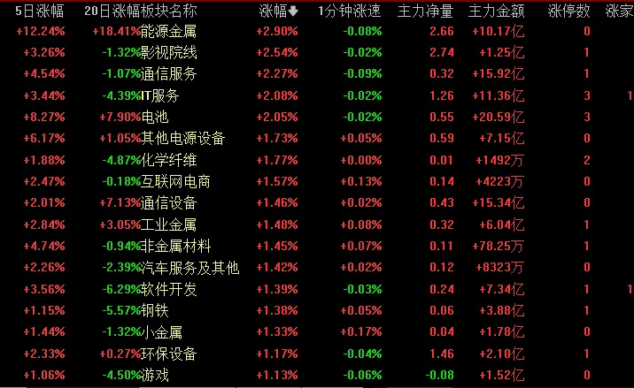从涨幅居前的板块和跌幅居前的板块来看,涨幅居前的偏成长风格,跌幅居前的是传统行业板块;今天表现亮眼的板块是能源金属、软件、游戏板块;