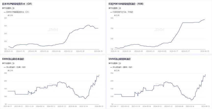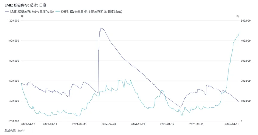 海外市场则呈现截然相反的库存格局,截至4月14日,LME铝库存降至393775吨,较前一交易日减少2200吨,持续刷新20年历史低位,海外可流通现货资源极度紧缺。