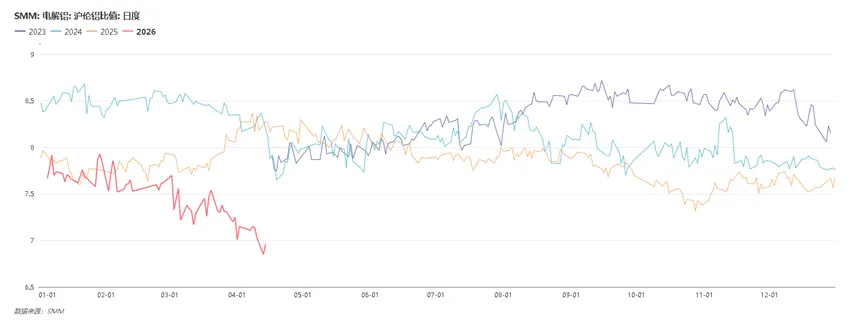 今年以来,沪伦比已经进入近年来历史地位水平,主要受国内库存压力与海外供应紧张的分化影响,导致沪铝估值相对伦铝存在一定折价。沪铝突破压力位后,估值修复需求释放,叠加海外缺铝格局持续强化,伦铝价格稳步支撑,进一步推动沪伦比向合理区间靠拢。当前沪伦比的修复,不仅缓解了前期沪铝估值偏低的局面,也为后续价格上行打开了空间。与铜、锡等有色的内外盘估值分化形成了鲜明对比。