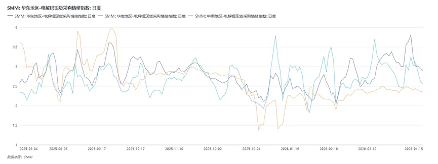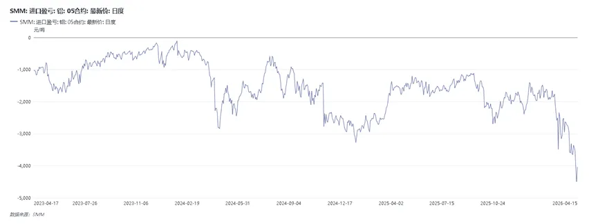 进口盈亏状况直接决定国内电解铝的进口意愿,进而影响国内市场供应格局。本周电解铝进口盈亏持续处于倒挂状态,进一步强化了国内供应端的刚性约束,为价格上涨提供支撑。根据进口成本测算公式,当前进口成本主要由伦铝价格、汇率、关税、增值税及杂费构成,截至4月15日,以伦铝3624美元/吨、汇率6.81、关税5%、增值税13%计算,电解铝进口综合成本约为27690元/吨,较国内沪铝主力合约价格25375元/吨高出4039.8元/吨,进口亏损幅度显著。