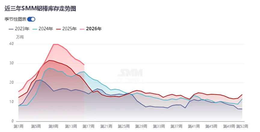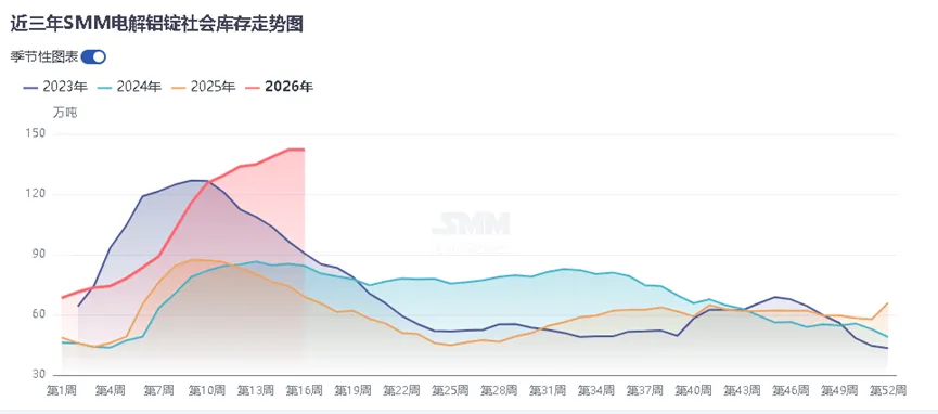 从国内市场来看,截至4月16日,SMM统计国内电解铝锭社会库存达142.3万吨,较上期降库1.1万吨,库存依旧高于历史同期水平;4月15日上期所沪铝仓单库存达43.86吨,较前一交易日增加3351吨,仓单累积趋势明显。但值得注意的是,国内高库存主要受下游复工节奏滞后、传统需求复苏不及预期影响,而新能源领域的强劲需求已开始逐步消化库存,铝棒库存呈现持续去库趋势,截至4月16日铝棒库存较上周减少1.95万吨,去库趋势较为明显。
