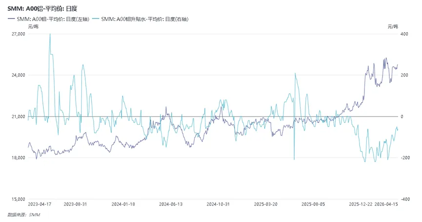 从市场成交来看,本周现货市场成交活跃度显著提升,贸易商惜售情绪浓厚,下游采购意愿增强,尤其是新能源、光伏、储能等领域的采购需求持续旺盛,带动铝板带、铝箔等加工品开工率维持高位。此外,沪铝主力合约本周增仓明显,资金做多情绪抬升。截至4月15日,国内A00铝锭现货均价突破24750元/吨,创下近五年新高。现货升贴水方面,前期持续的贴水格局逐步收敛,4月15日华东地区现货贴水为-60元/吨,较月初的-120元/吨明显修复,部分地区甚至出现小幅升水。