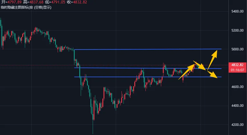 但下行风险同样不可忽视:美伊谈判结果不确定,不排除特朗普单方面撕毁协议,地缘政治反复仍会扰动走势;若多头有绝对动能,昨日不应冲高崩盘,4870反手打压大概率是主力收割追多筹码,后续易实现多空双杀,需重点关注。