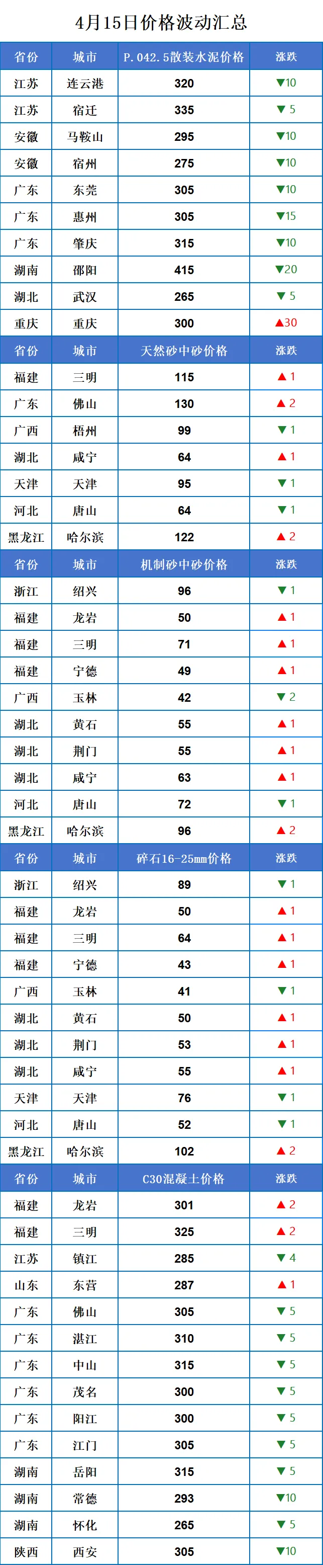 4月15日全国砂石行情涨多跌少,涨价地区集中在福建、湖北。
