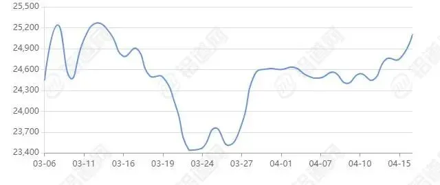 2026年04月16日上海期货行情价24950涨跌+110,最低24805,最高25375,前三日均价24668,前五日均价24618。