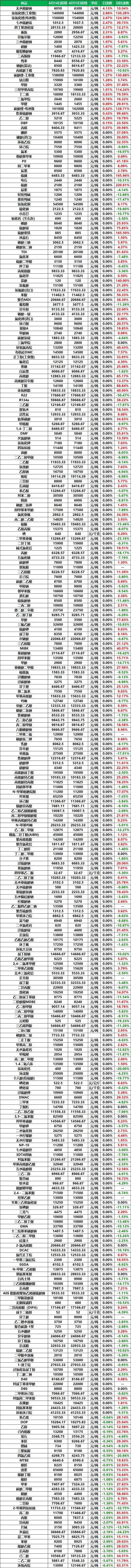 2026年4月15日大宗商品价格涨跌榜中化工板块环比上升的商品共26种,涨幅前3的商品分别为无水醋酸钠(4.13%)、氢氧化锂(工业级)(2.86%)、氢氧化锂(电池级)(2.67%)。