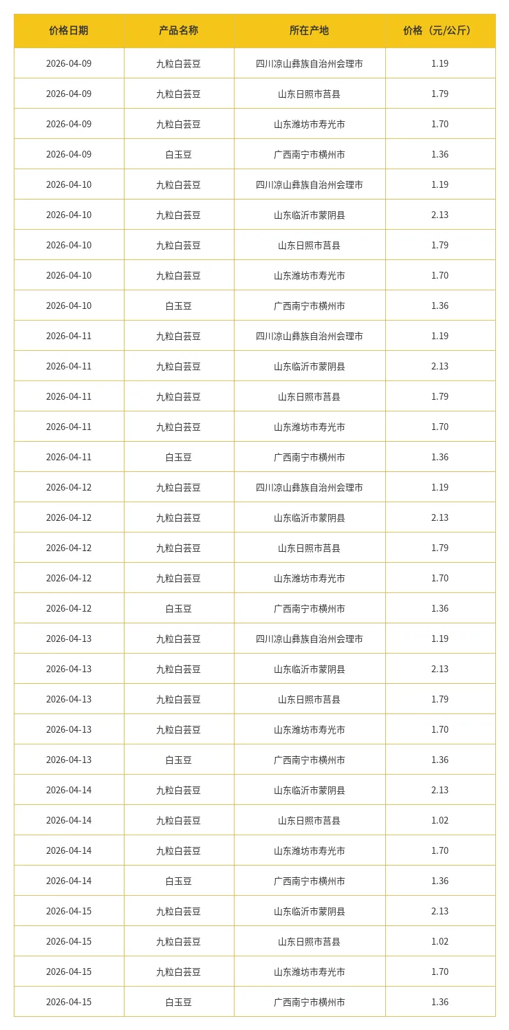 本周(4月9日--4月15日)豆科产品主要产地价格如下表: