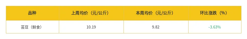 本周芸豆(鲜食)全国市场价格略有所下跌,下跌幅度3.63%