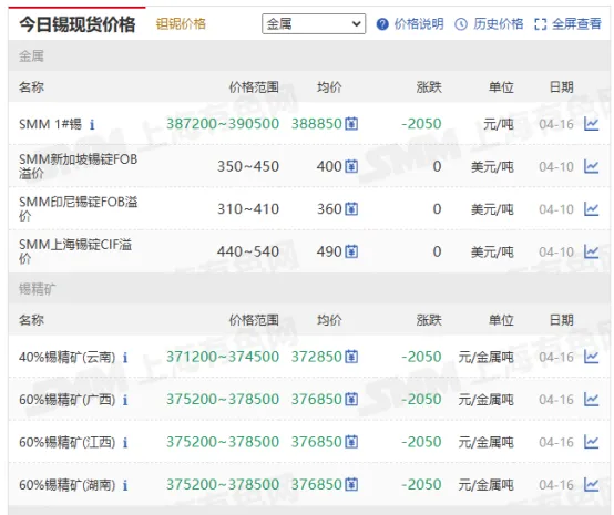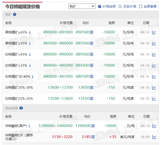 2026 年 4 月 16 日(周四),国内有色市场整体分化加剧,贵金属延续强势上行格局,基本金属高位持稳运行,小金属板块弱势格局进一步凸显。其中钨系品种延续多日下行趋势,今日再度大幅下调,主流品位钨精矿均价跌破 89 万元 / 标吨关口;钽系全产业链同步走弱,上游矿价领跌市场;铌价保持长期平稳,无明显波动。