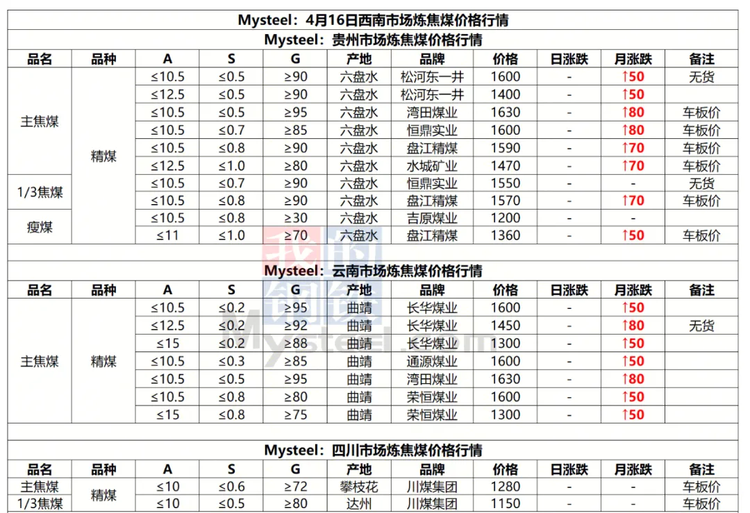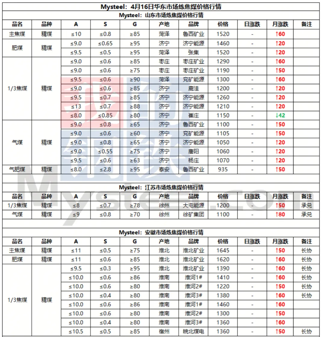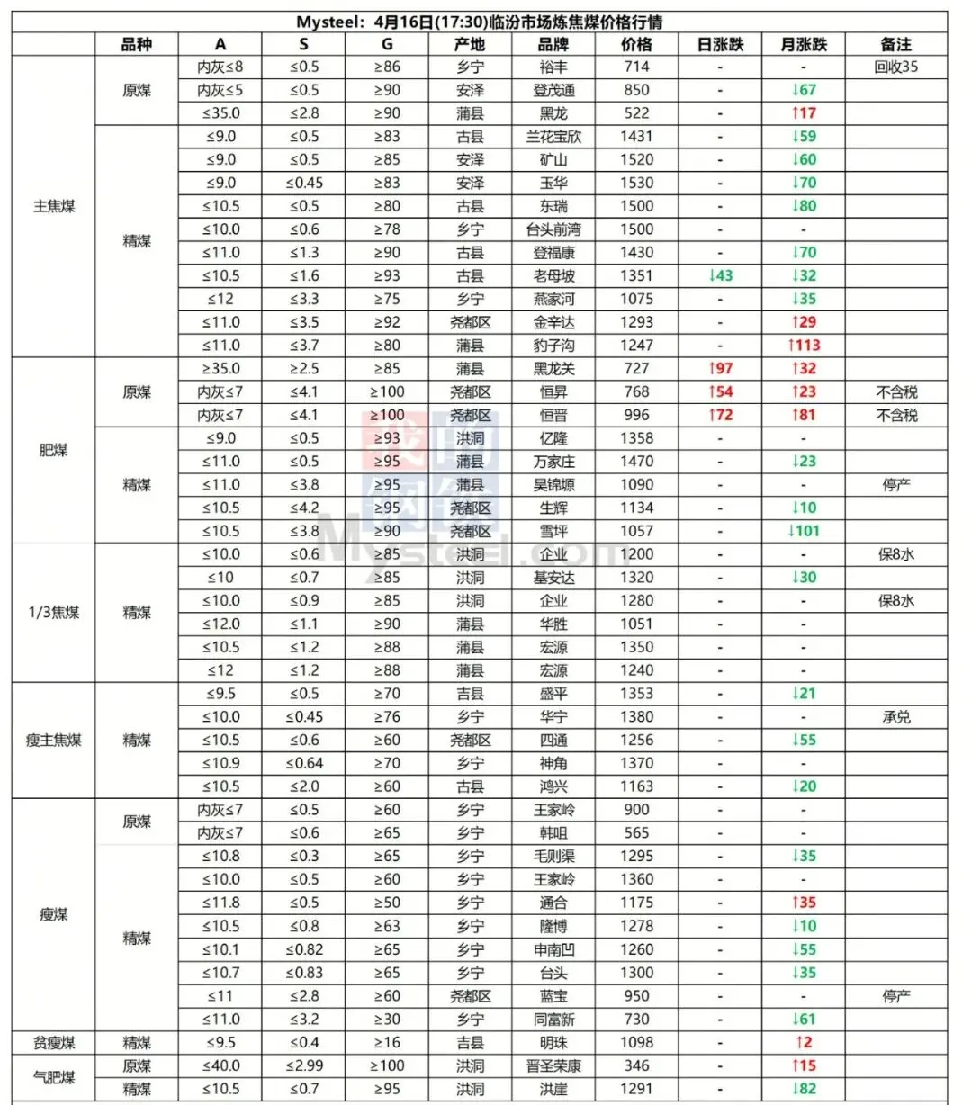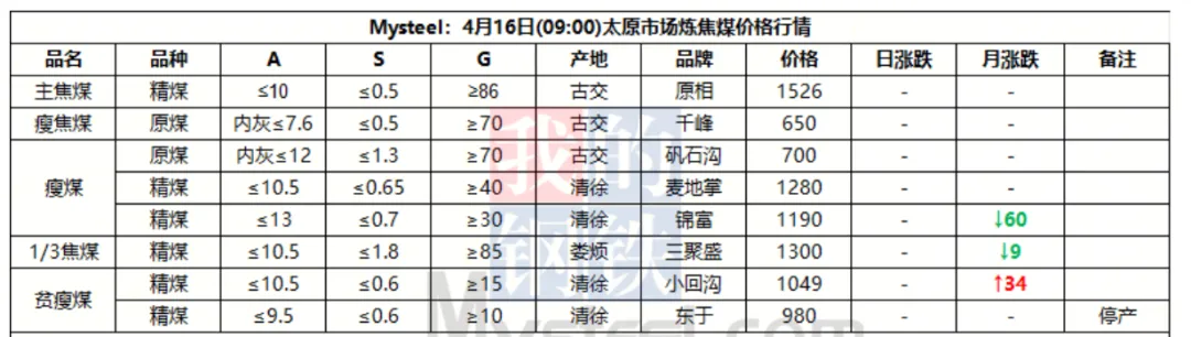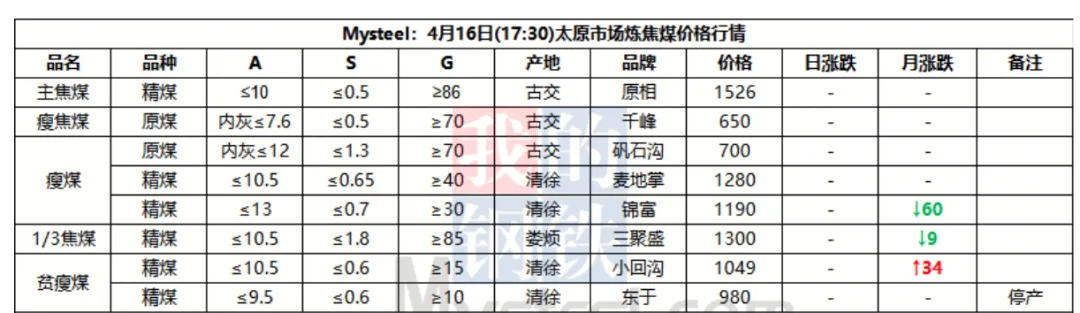 16日太原市场炼焦么价格暂稳。本周炼焦煤市场行情震荡,主产地煤价逐步止跌企稳,部分煤种止跌反弹。随着假期临近,焦煤库存偏低的焦企开始着手增储补库,需求有所改善,短期成材旺季需求仍在兑现,短期煤价支撑性较强,行情维持窄幅震荡。现古交低硫主焦煤出厂含税价1526元/吨;清徐瘦煤出厂含税价1280元/吨。