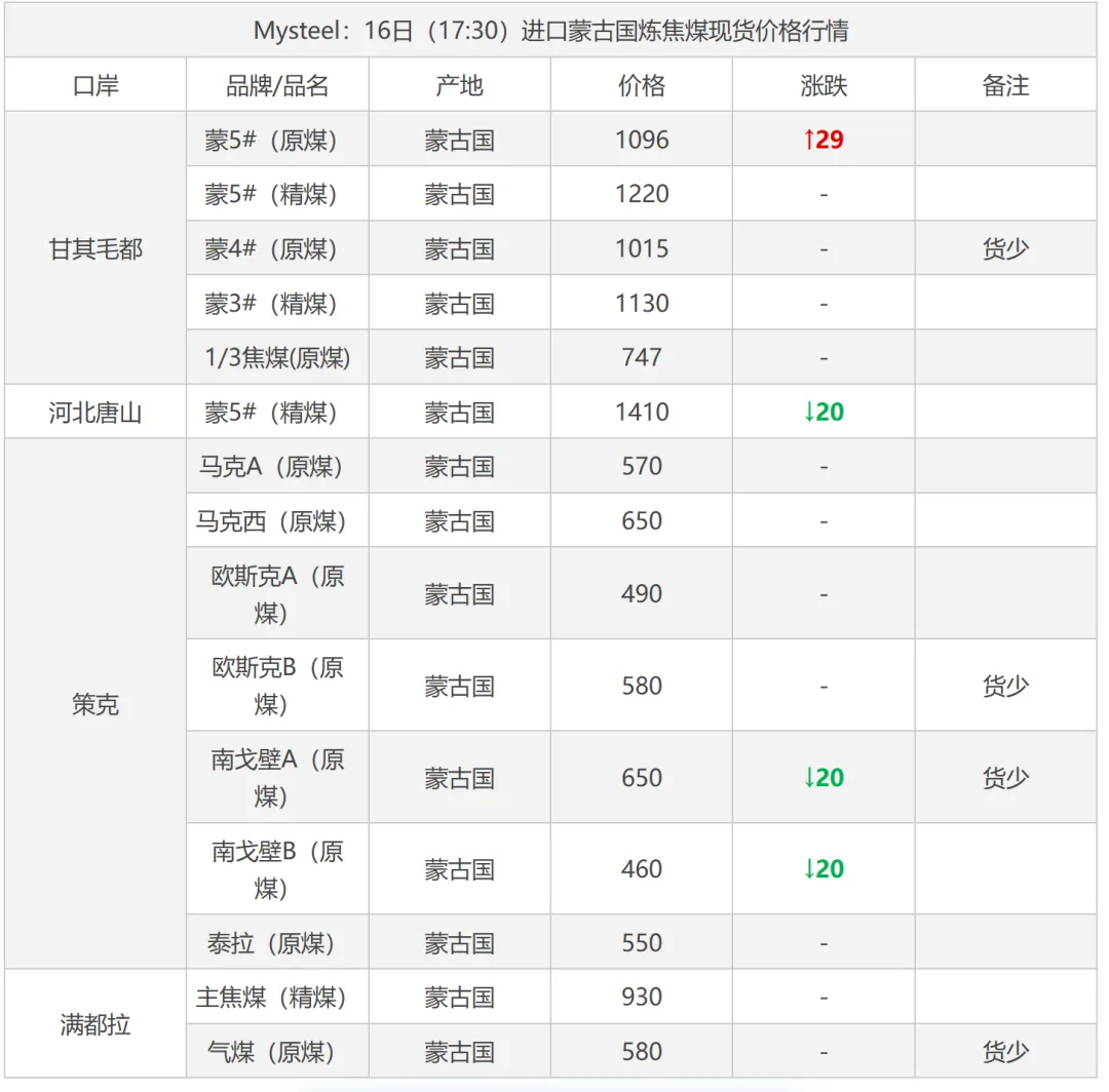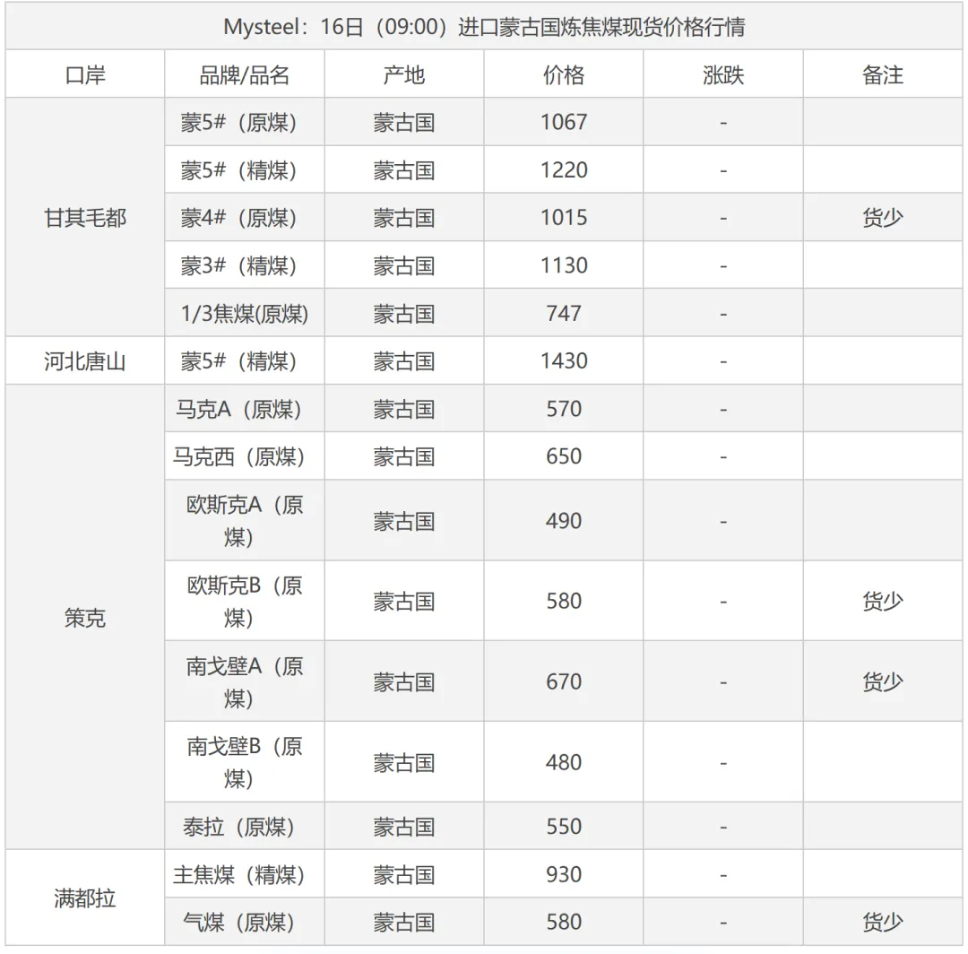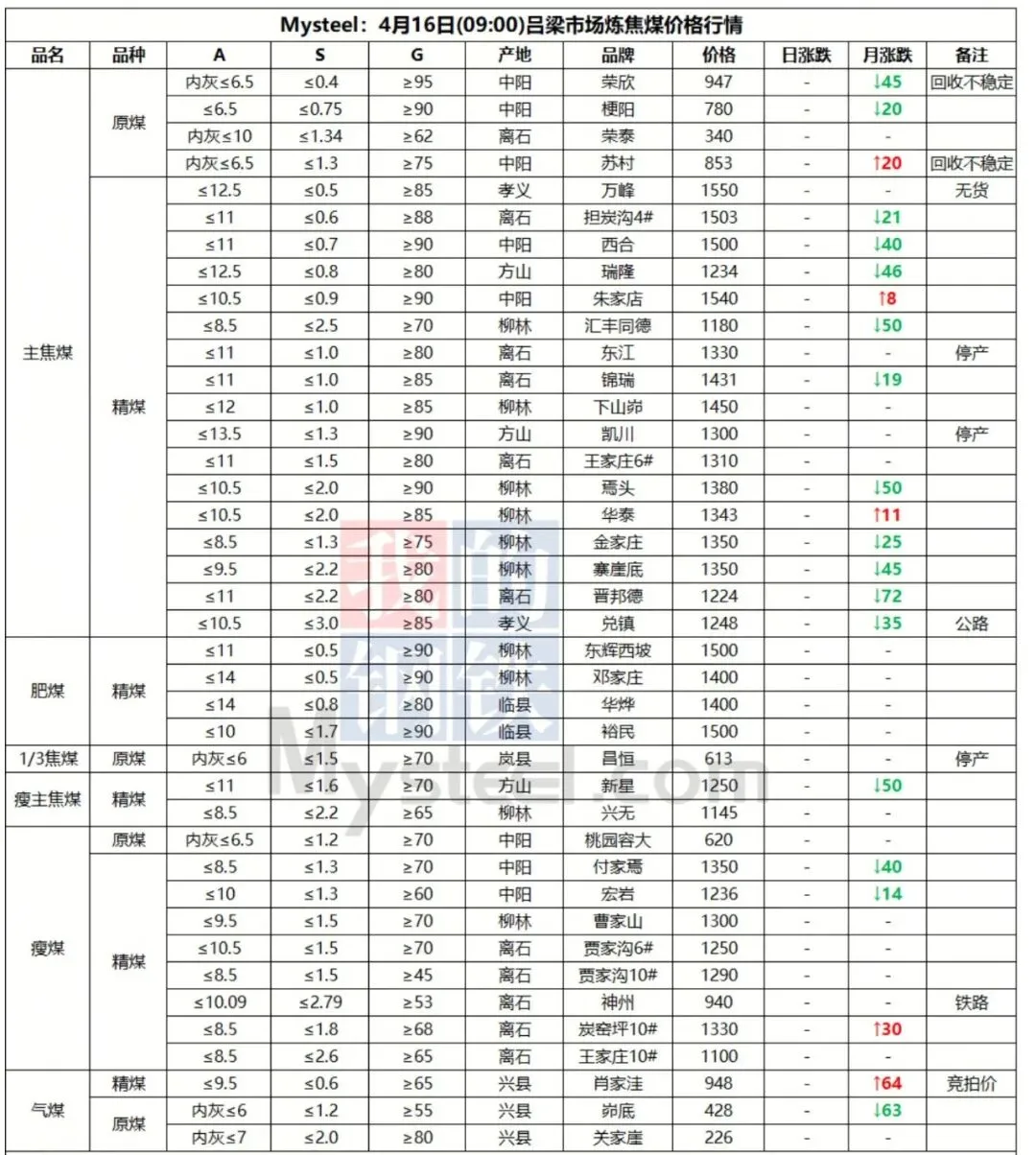 16日吕梁市场炼焦煤震荡运行,线上竞拍涨跌互现,市场采购情绪有所好转。产地端煤矿新签订单有增多,库存仍处于中低位,多数煤矿出厂价持稳,个别煤矿线上竞拍有小幅回落。中间洗煤及贸易企业采销情绪一般,观望心态浓厚。近期下游有陆续补库,采购量较小,焦炭提涨第二轮暂未落地,预计落地时间推迟,炼焦煤有止跌企稳的迹象。短期内炼焦煤价格窄幅震荡运行,价格涨跌互现。