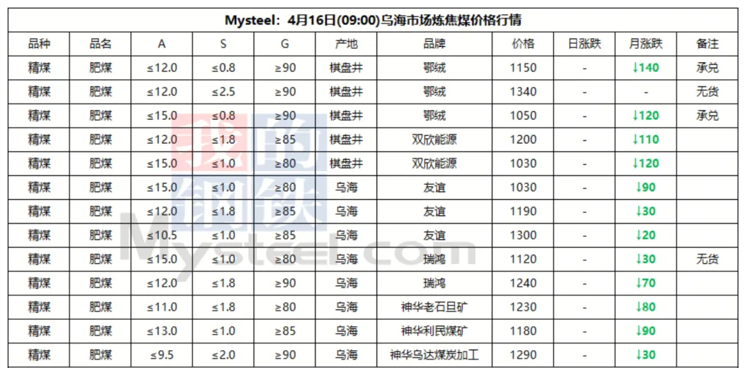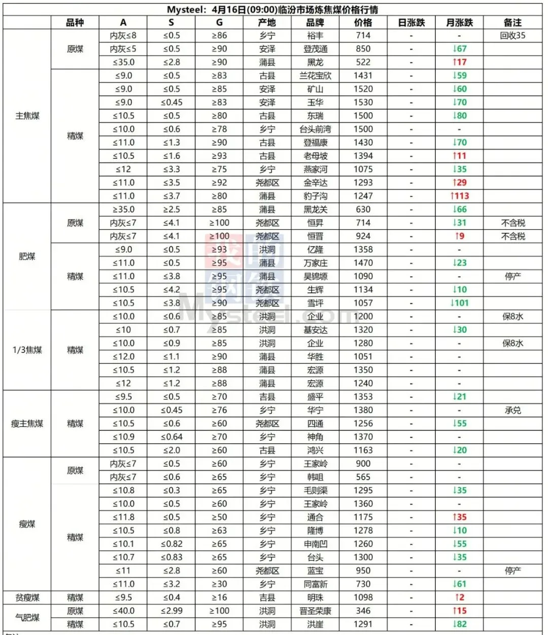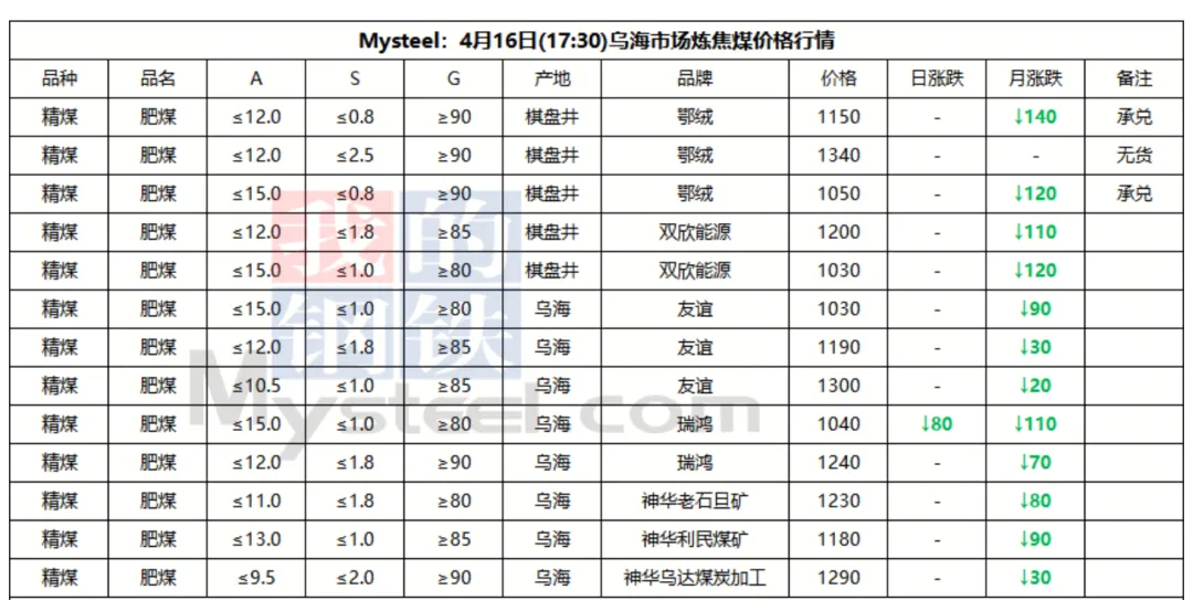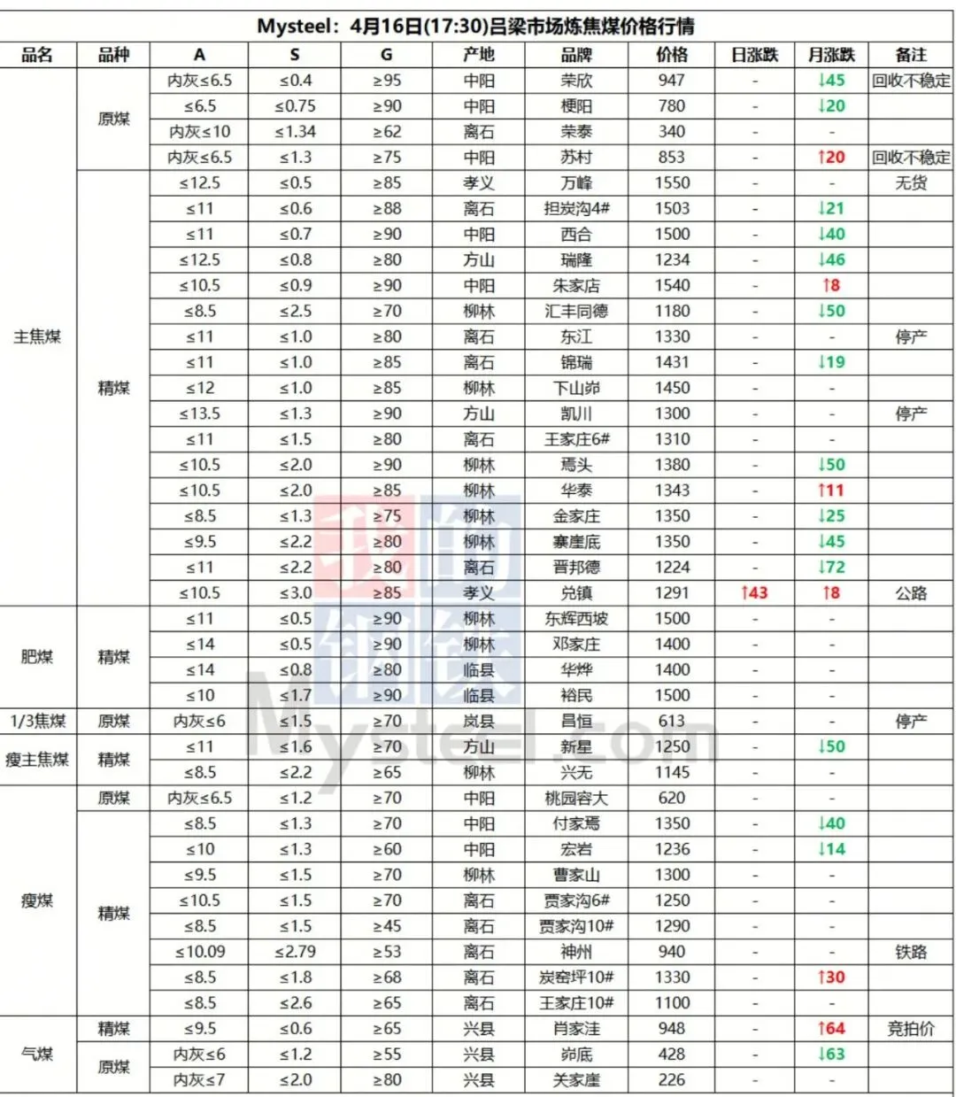 16日吕梁市场炼焦煤震荡运行,线上竞拍涨跌互现,市场采购情绪有所好转。产地端煤矿新签订单有增多,库存仍处于中低位,多数煤矿出厂价持稳,个别煤矿线上竞拍有小幅回落。中间洗煤及贸易企业采销情绪一般,观望心态浓厚。近期下游有陆续补库,采购量较小,焦炭提涨第二轮暂未落地,预计落地时间推迟,炼焦煤有止跌企稳的迹象。短期内炼焦煤价格窄幅震荡运行,价格涨跌互现。
