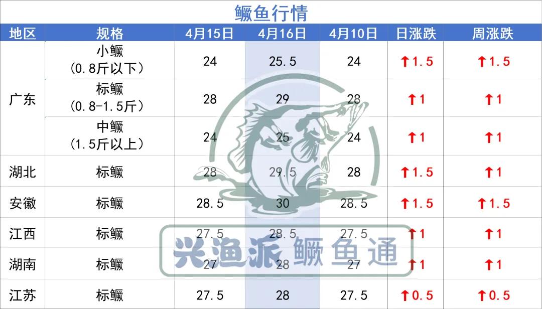 4月16日,近期鳜价涨势提速,各地涨0.5-1.5元/斤,市场需求增多,加之节假日影响,后续鳜价或将小幅涨价,逐渐持稳。