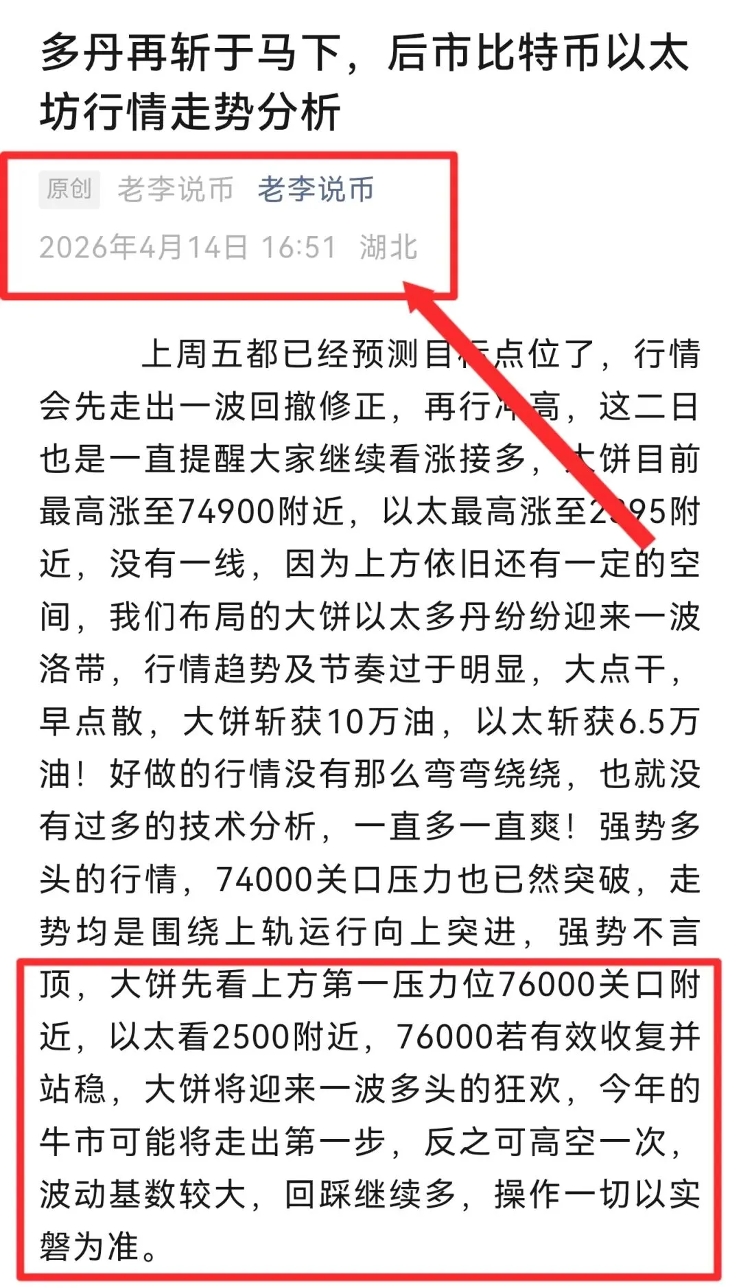 近期行情比较好做,一直带學员们有效累积苍位,打油的打油,翻苍的翻苍,更新的策略也就比较少,但不得否认的是,我们给的策略分析及点位含金量一直在,前日午后看涨思路给出后,继续提醒大家大饼看上至76000,再行反手高空,大饼最高涨至76009一线,最低回落至73449一线,然后再次回到74500附近走震荡修整,行情节奏一直拿捏在手,如若最近一直处于盲目做丹边缘,没有思路,可随时找到老李,或许你的一次选择,就将改变你的现状。