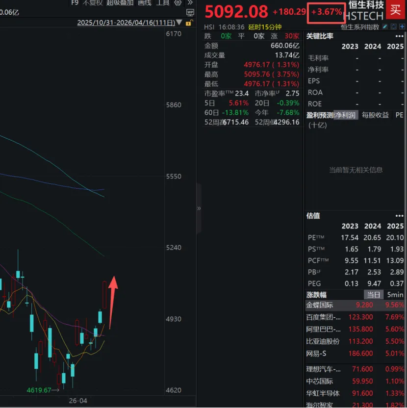 恒指上涨1.72%,恒科大涨3.67%。