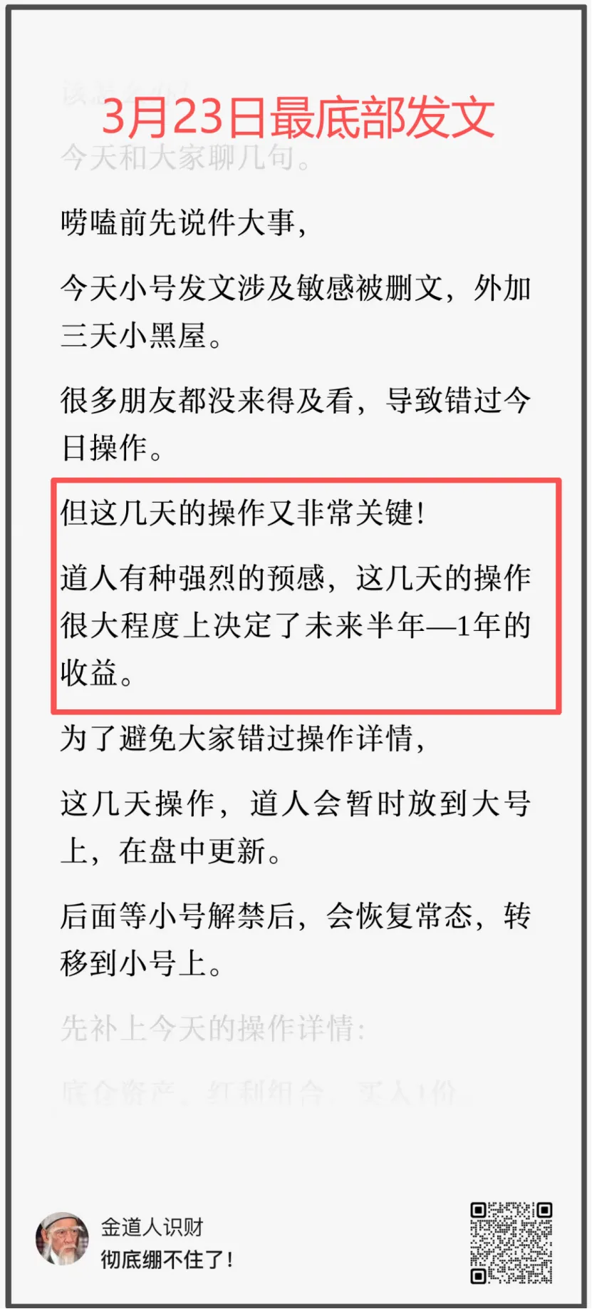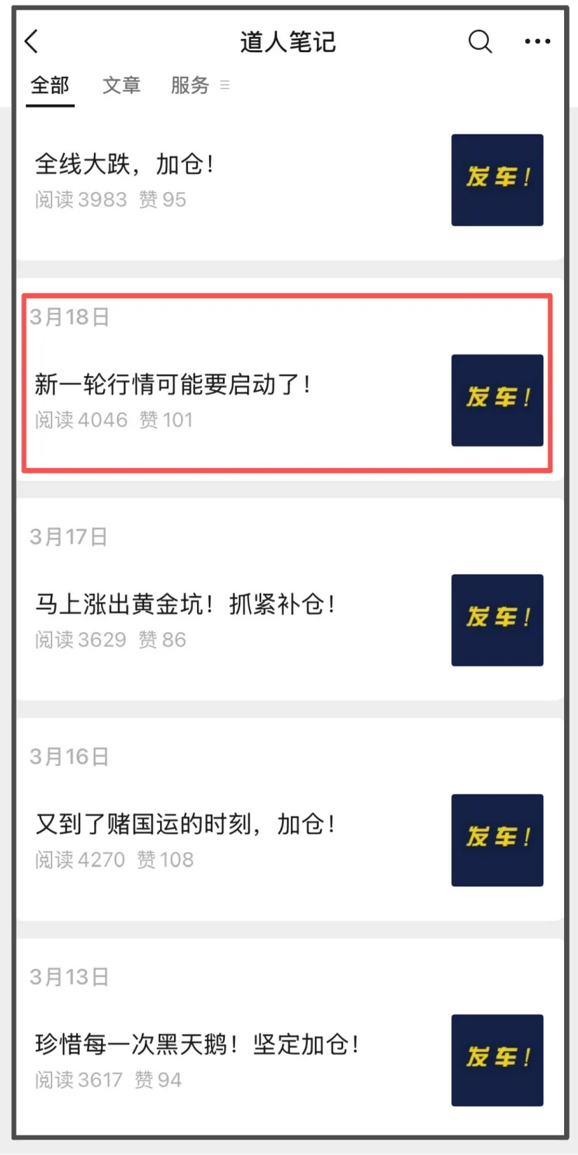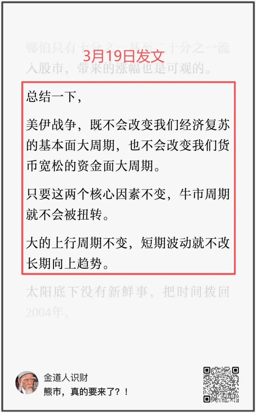 这是我们的小号“道人笔记”,在3月18日和大家讲的,以及我们当时疯狂在做的——越跌越买,疯狂加仓。