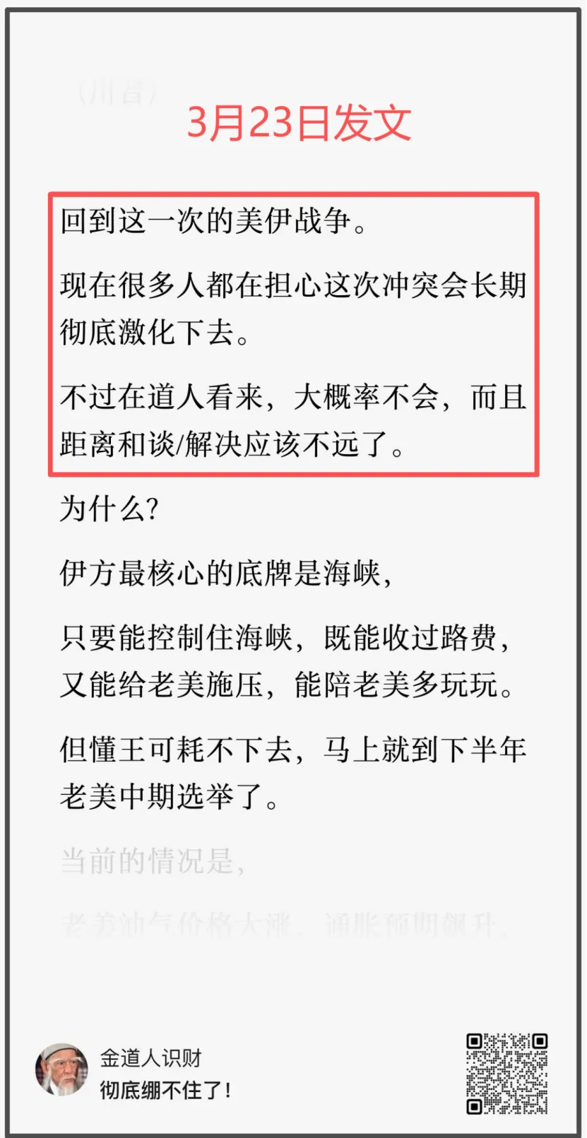 否则冲突持续,油价飙升,老美经济陷入通胀甚至滞胀,就等着被清算吧