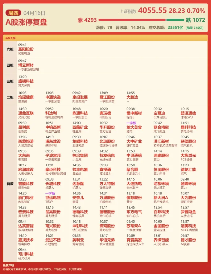 “流动性不紧 + 风险偏好回升 → 资金选择景气/弹性方向(算力租赁/云/AI 为绝对主线,一季报预增提供确定性共振,钛白粉涨价逻辑做支线)→ 普涨格局 + 涨停扩散。”