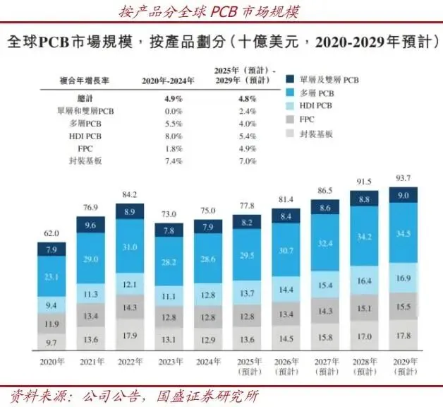 以销售收入计,全球PCB市场规模从2020年的620亿美元增长至2024年的750亿美元,CAGR为4.9%。预计到2029年,全球PCB市场销售收入将达937亿美元,2025年至2029年CAGR为4.8%。