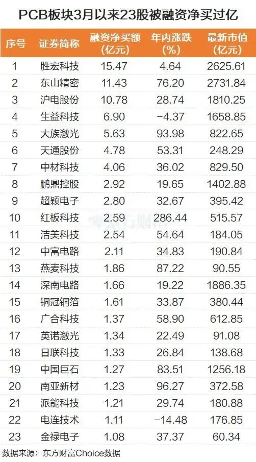 个股而言,随着PCB板块的持续走强,杠杆资金也在积极抢筹产业链个股。比如胜宏科技,3月以来被融资净买入15.47亿元;东山精密被融资净买入11.43亿元;沪电股份被融资净买入10.78亿元。生益科技、大族激光、天通股份也被融资净买入靠前。东方财富Choice数据显示,3月以来,PCB板块有23股被融资净买入过亿。