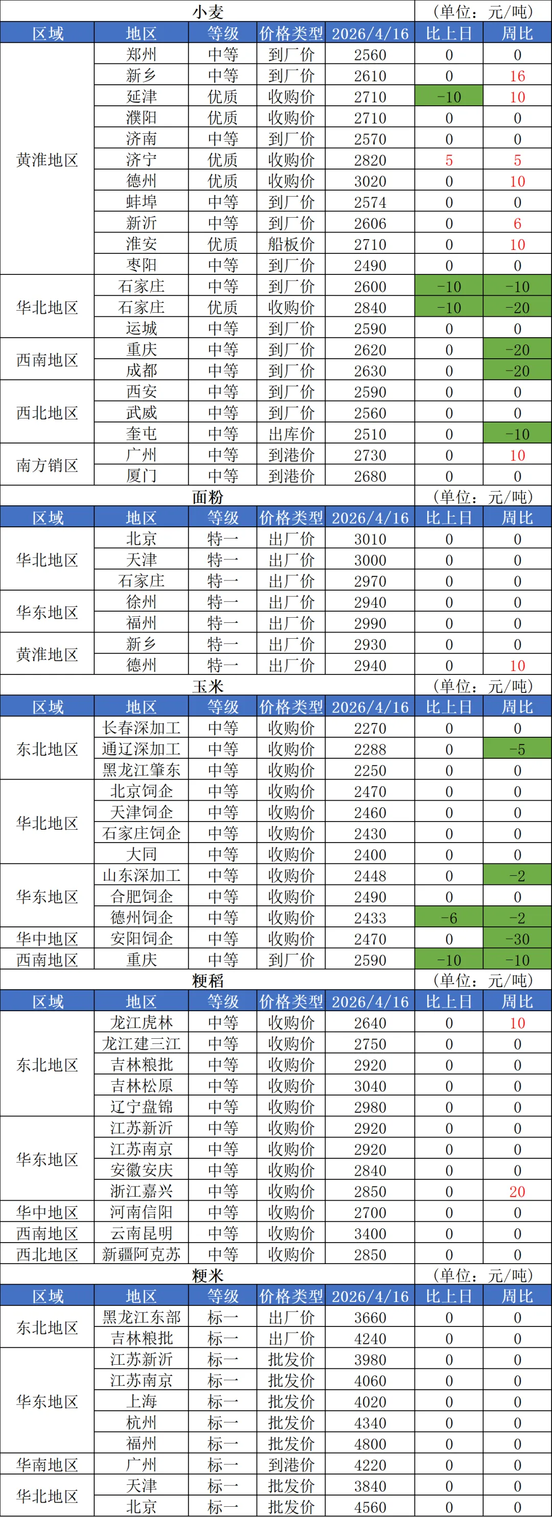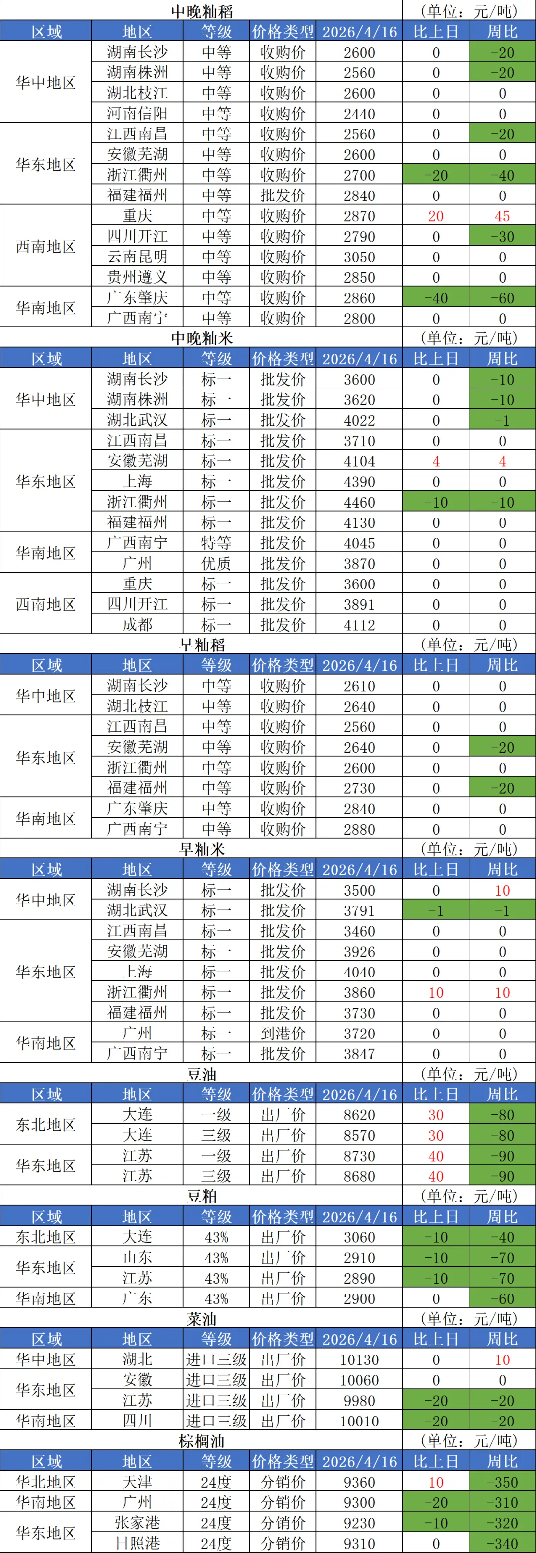 1、4月16日,国内小麦市场整体平稳运行,零星面粉企业小幅调整收购价格,调整幅度在2-5厘。目前市场多空主体博弈加剧,购销主体操作谨慎,麦价缺乏大幅波动的驱动因素。2、据农业农村部监测,4月份全国生猪价格继续走低,已经连续10周下降,处于七年来的低点,据上市猪企公开的财报数据,3月份生猪出栏总量1534.48万头,环比增加37.31%,同比增加6.09%,当前生猪出栏量仍然处于增加态势。3、全国春灌有序推进,灌溉面积达1.9亿亩。眼下,黄淮海、西北等冬小麦主产区春灌已全面铺开;南方、东北等水稻主产区陆续开启春灌,保障育秧、泡田、插秧等关键环节用水。4、本周以来虽然油厂豆粕销售较好,但主要以远期合同为主,豆粕现货价格处于持续下行的趋势,目前已经失守于3000元/吨的重要关口,预计后期豆粕价格可能仍有下跌空间。5、本周棕榈油现货价格跟盘下跌,提振终端逢低补货,市场成交放量,但油厂库存仍处于近年高位,基差承压。预计短期棕榈油价格震荡偏弱,长期看,能源危机及生柴产业发展将持续支撑棕榈油消费需求。