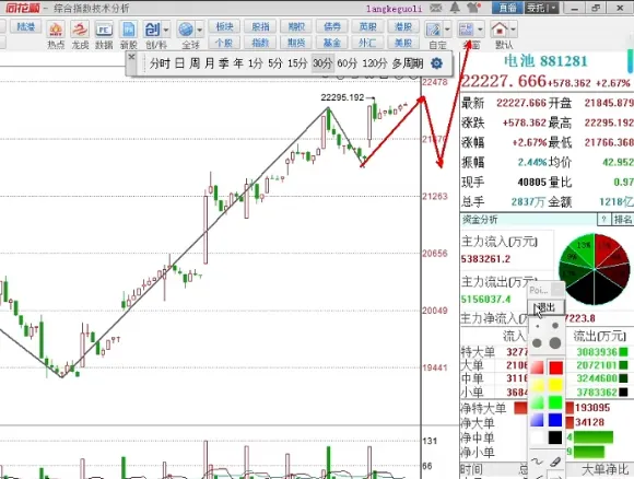 板块选择,硬件方向后续回调仍有机会,目前仅现一次明显回调,上涨结构未完;电池方向30分钟二买确立,中线无碍;软件端IT服务与传媒保持跟踪,等待各自级别的节奏确认。