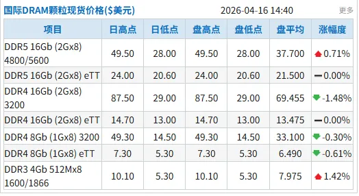 今日DRAM颗粒现货价格整体平稳,涨跌幅度都不大,例如DDR5 16Gb (2Gx8) 4800/5600上涨0.71%,均价37.7美元;DDR4 16Gb (2Gx8) 2666下跌0.15%,均价68.5美元。