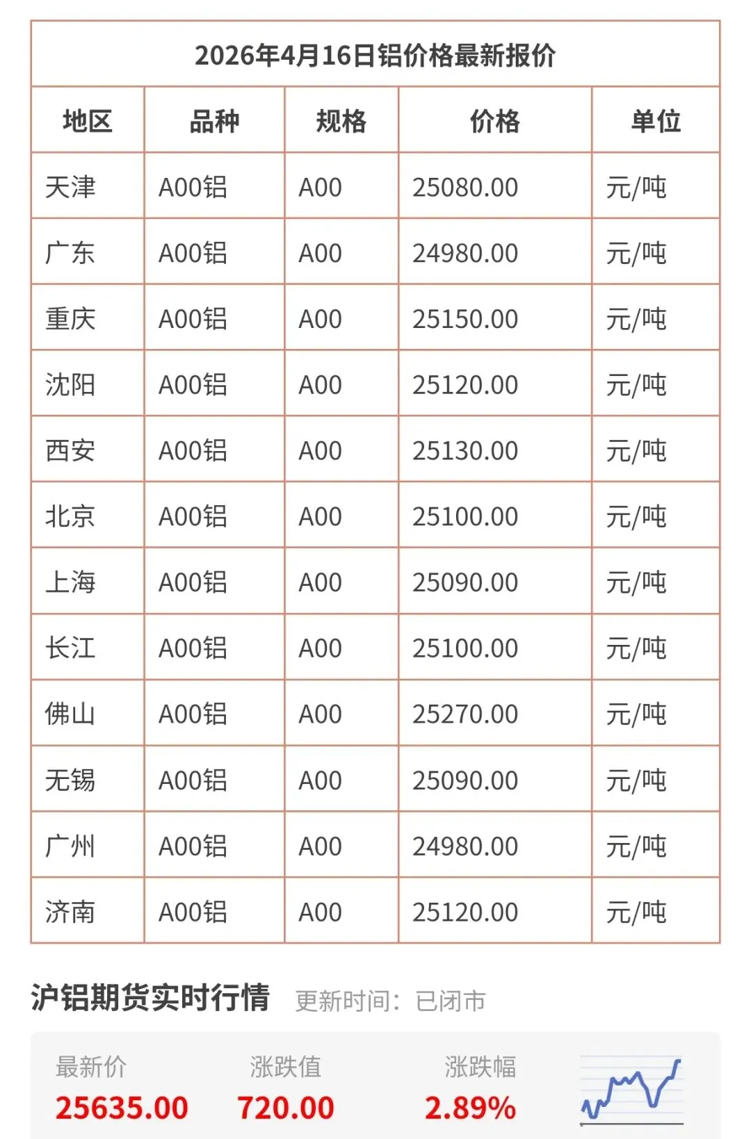 今天4月16日更新,今日铝价行情查询,包括天津、广州、上海、北京、无锡、广东、佛山等地区铝现货价格!长江有色铝锭最新价格是多少钱一公斤一览表