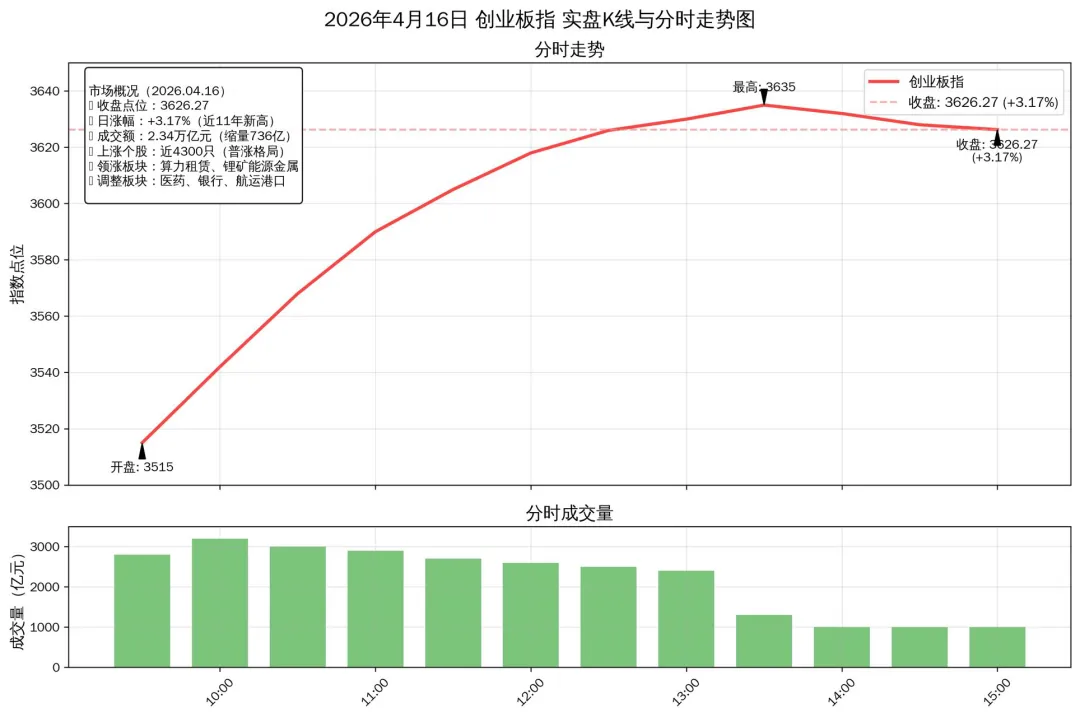 2026年4月16日,A股市场迎来标志性的强势反弹行情,创业板指成为全场领涨先锋,全天高开高走,最终大涨3.17%,收报3626.27点,一举刷新近11年收盘新高,为市场注入强劲信心。当日全市场呈现普涨格局,近4300只个股飘红,市场情绪显著回暖,但成交额约2.34万亿元,较前一交易日小幅缩量736亿元,呈现“缩量上涨”态势,为后续行情埋下值得关注的信号。