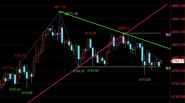 进入晚间美盘阶段,随着初请数据正式公布,市场情绪出现明显转向,黄金价格承压迎来快速回落,空头短暂发力下探,盘中最低触及4773位置。尾盘阶段行情逐步震荡修复,跌幅有所收窄,最终收盘于4790点位。从日线级别来看,昨日黄金收出一根带有明显长上影线的十字阴线,这一形态充分表明,金价在近期高位面临极强的上方抛压,前期持续的多头上涨动能已经大幅衰竭,短期市场步入高位震荡偏弱的运行格局。