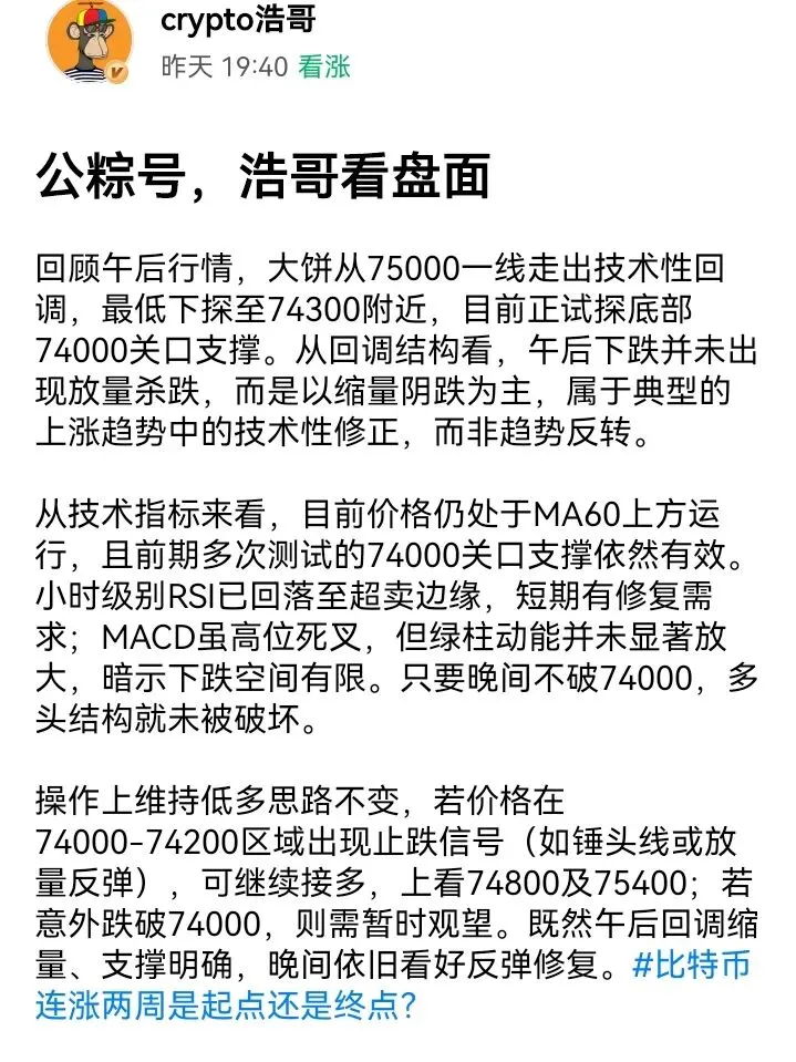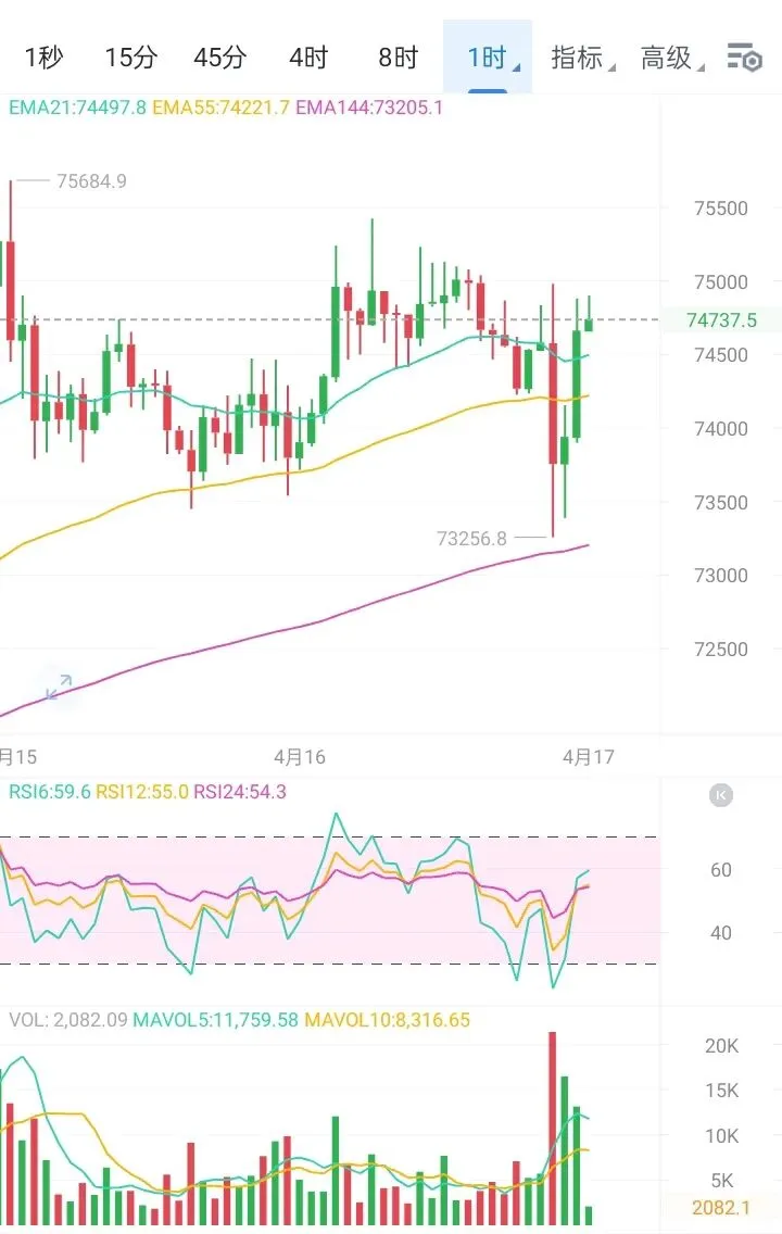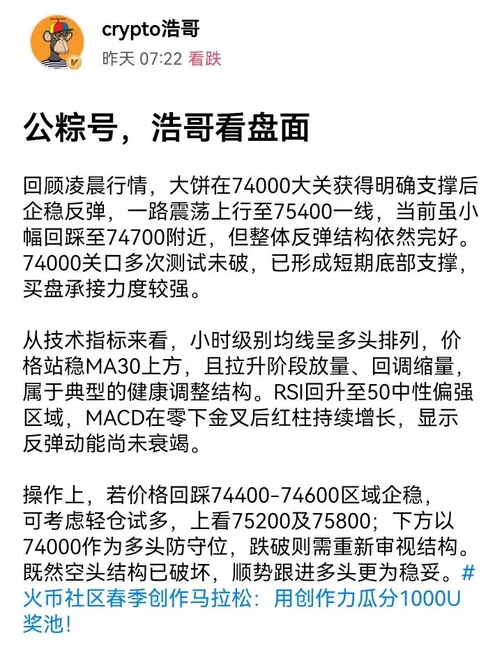 操作上,若价格回踩74200-74400区域企稳,可轻仓试多,防守放在73800下方,目标先看75000,突破再看75400。既然空头未能延续且支撑有效,顺势低多更为稳妥。