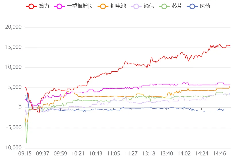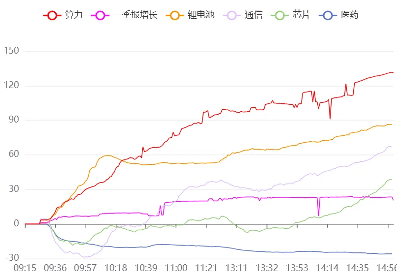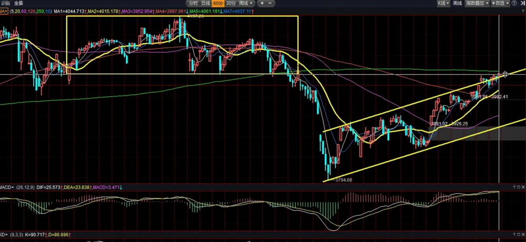 上证指数涨幅小,深成指和创业板涨幅大,创业板呈主升浪结构,60分钟指标高位,KD指标开始钝化。成交量持平或微微缩量,缩量目前反而利于市场,如放量容易出现加速见顶回落。预计上证指数后期会补涨,如早盘冲高不建议追,以防回落。中期积极看多做多,只要不跌破4月8日大阳线,类似去年12月缩量上行,未来一个半月是做多窗口。