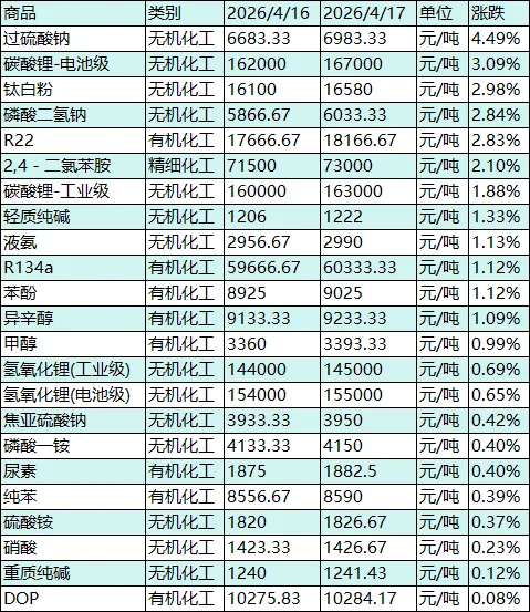 -上涨梯队呈现“极端引领、多板块覆盖、梯度清晰”特征:上涨品种涵盖锂电材料、无机化工、有机化工、精细化工等多个领域,形成完整的梯度上涨格局。极端上涨品种以过硫酸钠为核心,报价从6683.33元/吨涨至6983.33元/吨,涨幅达4.49%,成为今日涨幅最大的品种;中幅上涨品种包括碳酸锂-电池级(+3.09%)、钛白粉(+2.98%)、磷酸二氢钠(+2.84%)、R22(+2.83%),涨幅均超2.8%,表现强势;次中幅上涨品种为2,4-二氯苯胺(+2.10%)、碳酸锂-工业级(+1.88%),涨幅在1.8%-2.1%区间;温和上涨品种涵盖轻质纯碱、液氨、苯酚等17种,涨幅在0.08%-1.33%区间,依托原料支撑与下游刚需,涨势稳健,无投机性波动,与锂电需求复苏、钛白粉行业涨价潮的态势高度契合。