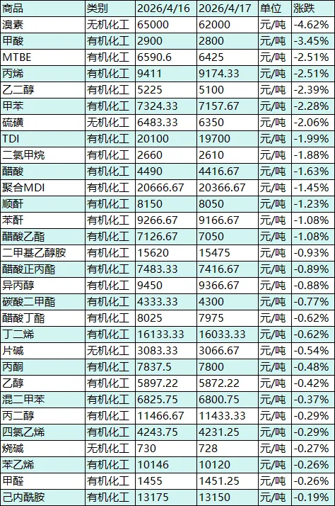 -回调梯队呈现“极端凸显、少数分散”特征:回调品种仅12种,数量较少且集中于少数细分领域,形成“极端回调+温和回调”的梯度格局。极端回调品种以溴素为核心,报价从65000元/吨跌至62000元/吨,跌幅达4.62%,成为今日回调幅度最大的品种;中幅回调品种包括甲酸(-3.45%)、MTBE(-2.51%)、丙烯(-2.51%),跌幅均超2.5%;次中幅回调品种包括乙二醇(-2.39%)、甲苯(-2.28%)、硫磺(-2.06%)、TDI(-1.99%),跌幅在1.9%-2.4%区间;小幅回调品种涵盖二氯甲烷、醋酸等8种,跌幅在0.19%-1.88%区间,多为短期供需波动或原料价格调整导致,无恐慌性抛售。