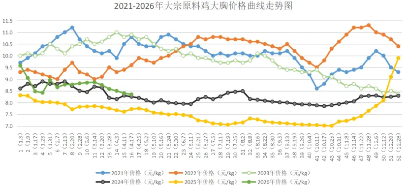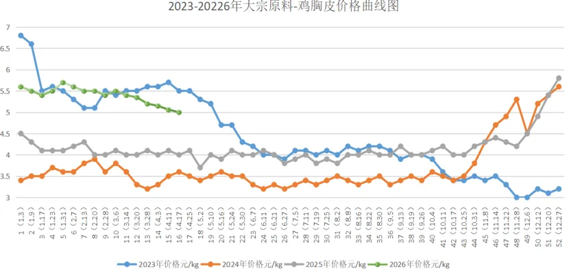 双汇标准原料板冻大胸本周均价8.35元/kg,较上周(8.40元/kg)下跌0.05元/kg,环比下跌0.60%;较2025年同期(7.72元/kg)上涨8.16%;较2024年同期(8.25元/kg)上涨1.21%;较2023年同期(10.90元/kg)下跌23.39%;较2022年同期(9.60元/kg)下跌13.02%;较2021年同期(10.80元/kg)下跌22.69%。3、鸡胸皮