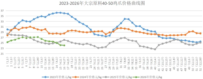 双汇标准原料鸡胸皮本周均价5.00/kg,较上周5.06元/kg下跌0.06元/kg,环比下跌1.19%;较2025年同期(4.00元/kg)上涨25.00%;较2024年同期(3.60元/kg)上涨38.89%;较2023年同期(5.50元/kg)下跌9.09%。4、40-50鸡爪