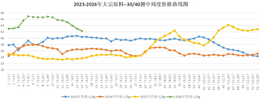 40-50鸡爪本周均价24.1/kg,较上周24.2元/kg下跌0.10元/kg,环比下跌0.41%;较2025年同期(25.50元/kg)下跌5.49%;较2024年同期(28.30元/kg)下跌14.84%;较2023年同期(36.20元/kg)下跌33.43%。5、30-40翅中