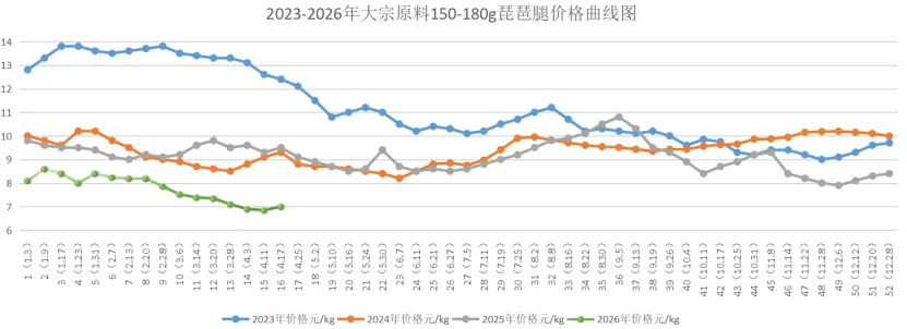 150以上琵琶腿本周均价7.0/kg,较上周6.85元/kg上涨0.15元/kg,环比上涨2.19%;较2025年同期(9.30元/kg)下跌24.73%;较2024年同期(9.10元/kg)下跌23.08%;较2023年同期(12.60元/kg)下跌44.44%。