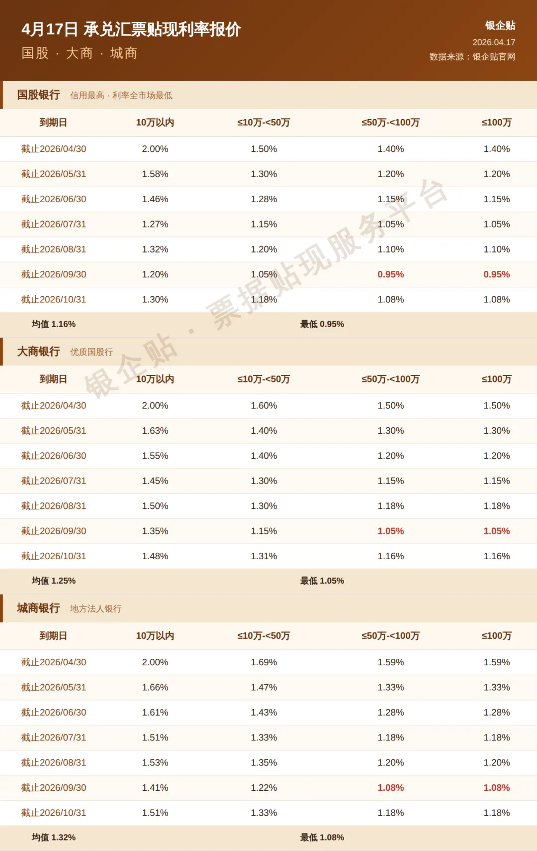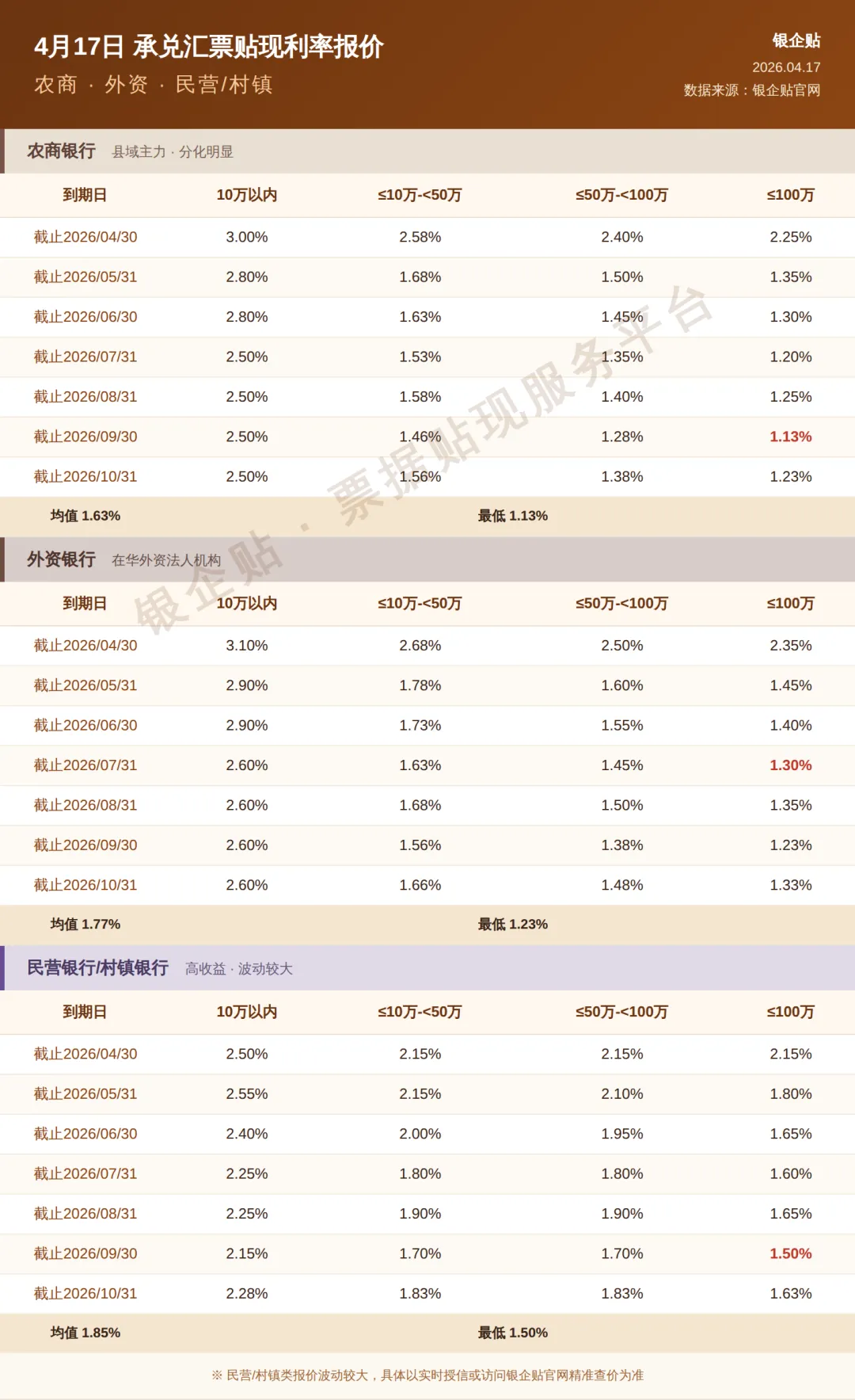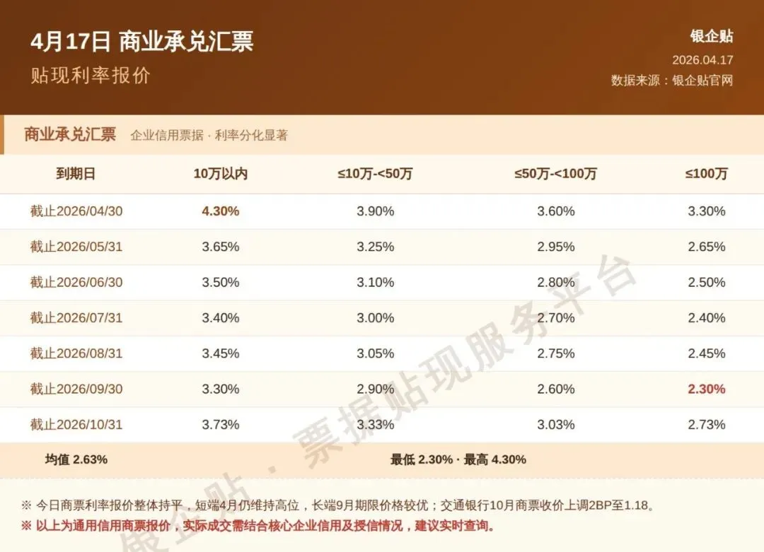 ※ 今日商票报价整体持稳,长端9月期限价格较优,短端4月仍维持3.30%以上高位。交通银行上调10月商票收价2BP至1.18,反映机构对长端商票配置意愿回升。