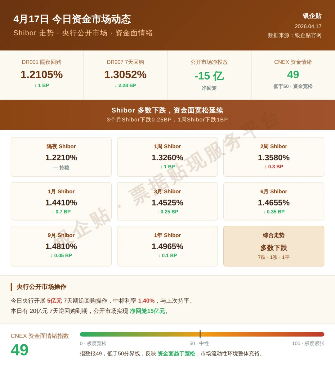 DR007 加权平均利率开盘下跌2.28BP报1.3052%,DR001 下跌1BP报1.2105%。CNEX全市场资金面情绪指数报49(低于50为宽松区间),资金宽松格局延续。