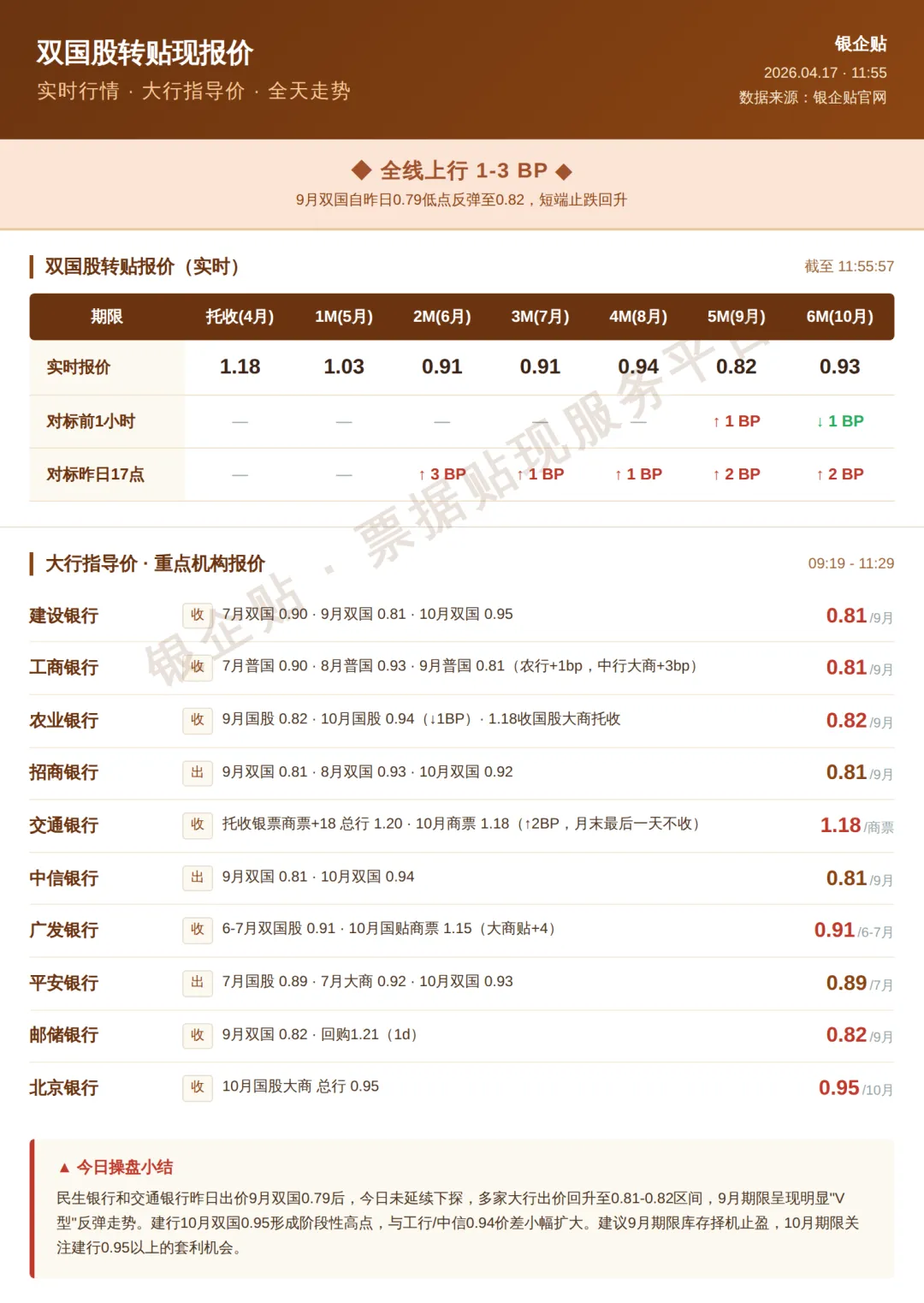 民生银行和交通银行昨日9月双国0.79创新低后,今日未延续下探,多家大行出价回升至0.81-0.82区间,9月期限呈现明显"V型"反弹走势。