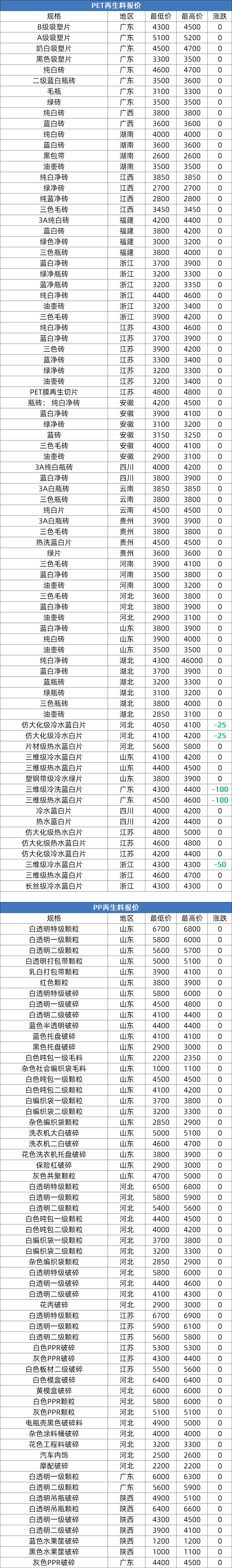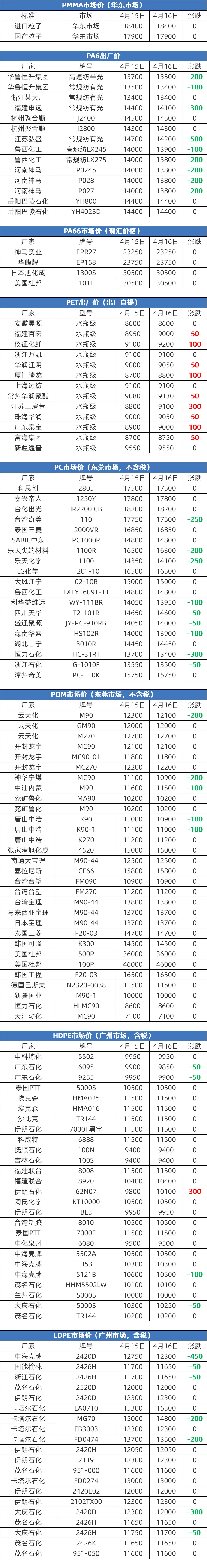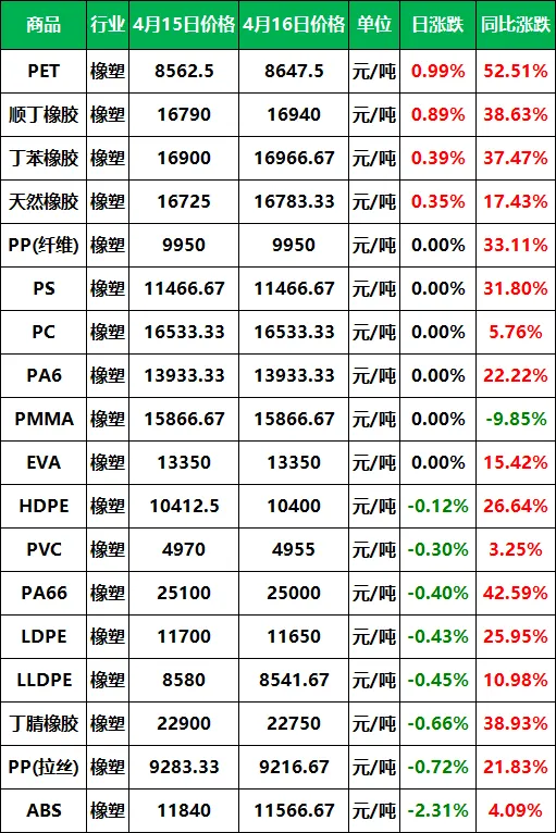 2026年4月16日大宗商品价格涨跌榜中橡塑板块环比上升的商品共4种,涨幅前3的商品分别为PET(0.99%)、顺丁橡胶(0.89%)、丁苯橡胶(0.39%)。