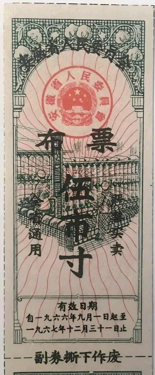 这个花纹繁琐的小票叫全国通用布票,摸一摸偏薄,颜色发旧,上面规规矩矩盖着红印,圈心是国徽,票面竖着一排黑字“布票 伍市寸”,再往下还写着使用和期限,那时候一年下来也发不了多少,做全套新衣是不敢想的,有的能换点补丁布,还真舍不得随便用光。