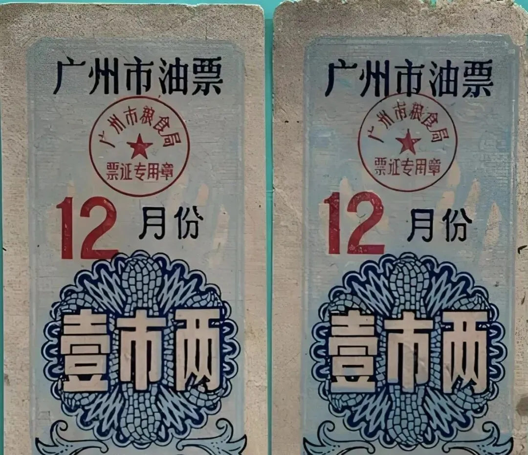 油票就是图上这一对“广州市油票”,十二月份壹市两的,淡蓝底色压着大红印章,谁家厨房里有油,是要靠这张票去凭票买,一家几口省着点用,逢年过节才能多打点油,平日煮菜炒饭,锅底溜些油星,味道就出来了。