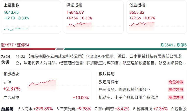 深证成指和创业板指表现相对较强,创业板指盘中一度刷新近11年新高。