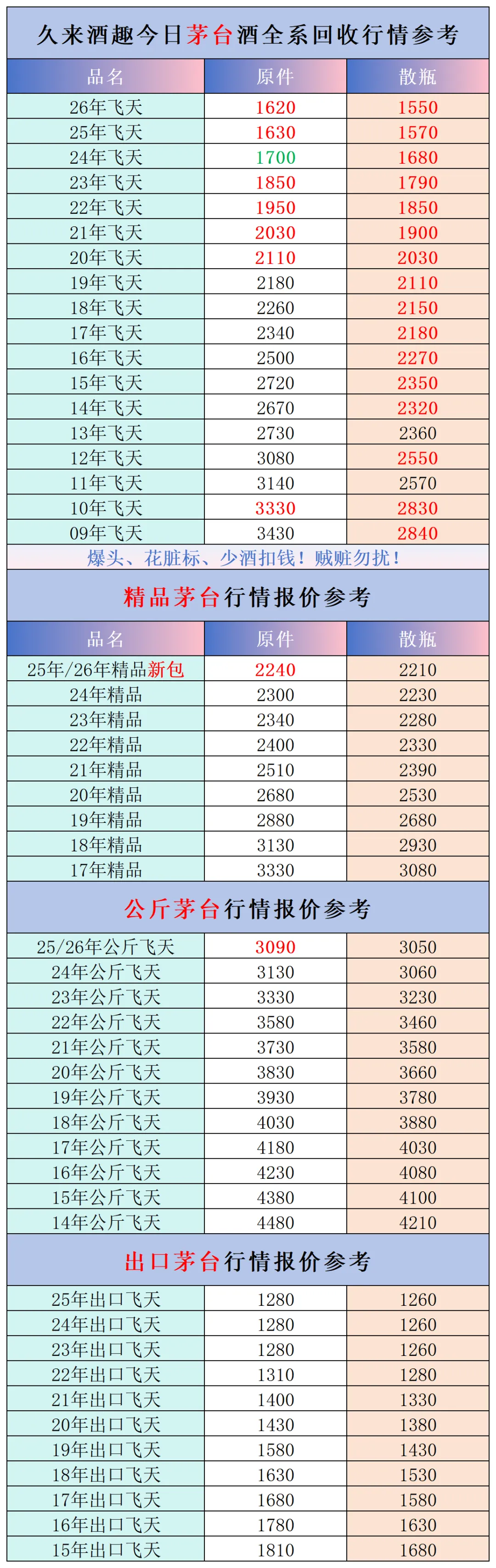 本公众号提供各种名酒回收行情报价,常规茅台、五粮液、洋河、剑南春、国缘等。所有报价根据市场买卖行情总结而来,每天更新最新报价!部分酒水每天涨跌幅较大,无法及时更新请谅解。本报价仅供参考,并非实际成交价格。感谢您的关注!我们会竭尽所能,提供更多更好的服务。