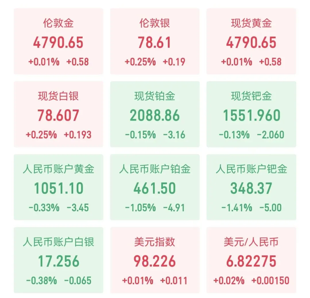 4月17日今日亚市早盘,国际现货黄金短线震荡运行,当前报价4790美元/盎司附近。国内黄金T+D同步波动,报价1051.80元/克。昨日美国特朗普表示:美、以、伊朗的战争“即将结束”,而白宫对达成协议表示乐观,称本周末可能会在巴基斯坦举行更多面对面会谈,黄金价格冲高回落,最终收跌0.02%,报4790.66美元/盎司。