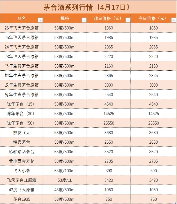 京日酒价:每日名酒行情(4 月 17 日)