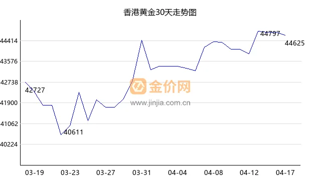 今日香港黄金下跌,现价44536 港币/两,今日开盘价44619,最高价44670,最低价44364。