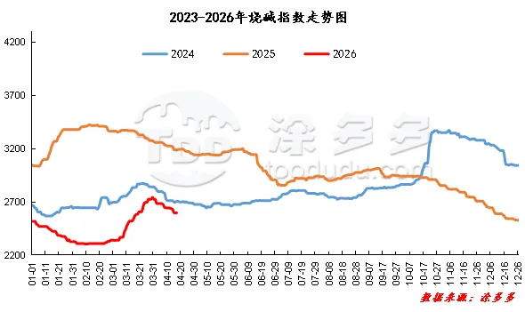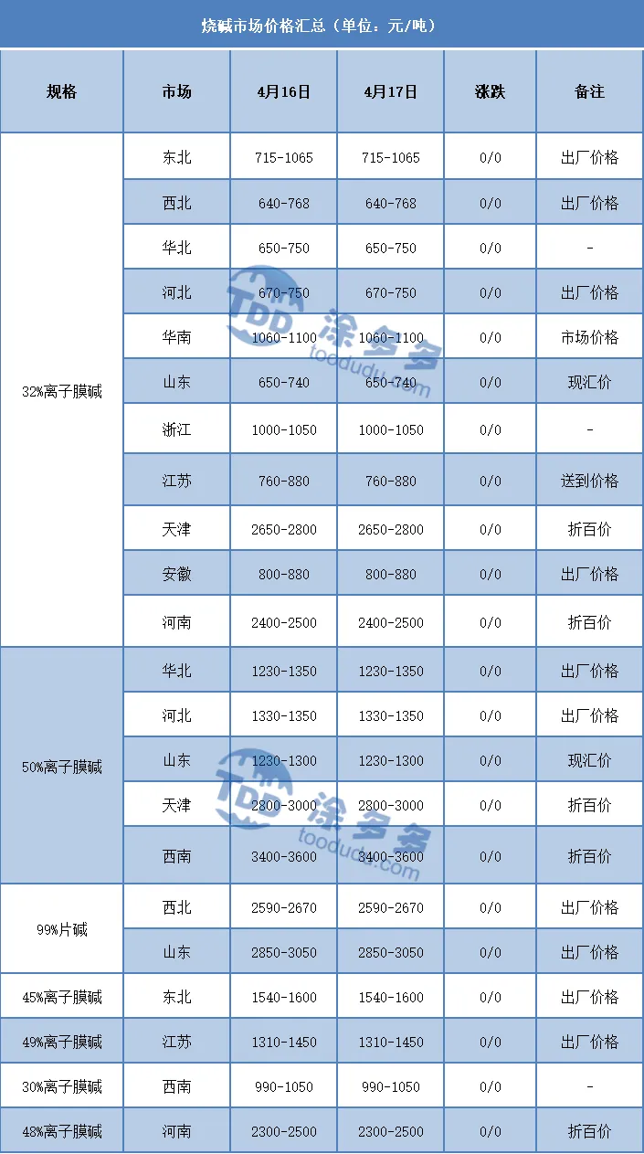 据涂多多数据测算,4月17日国内烧碱指数为2597.98,持稳。
